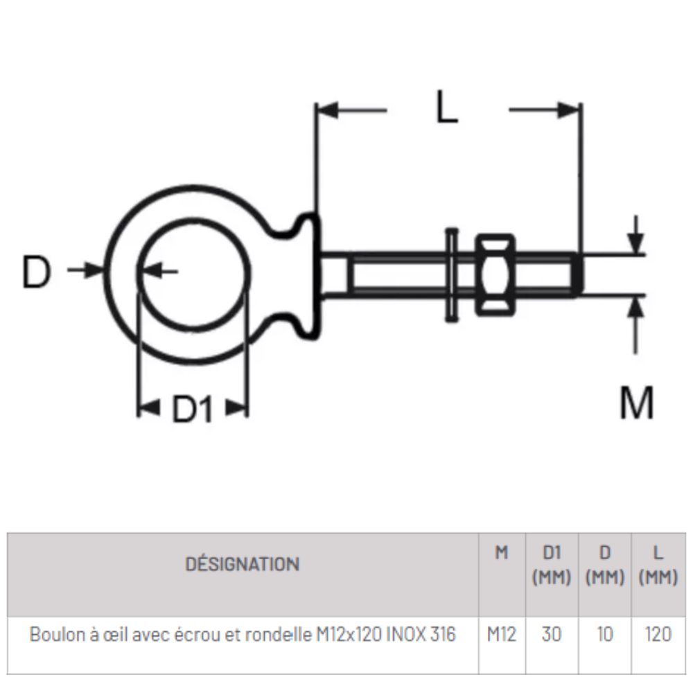 Il s’agit d’un boulon à œil en inox 316 équipé d’un écrou et d’une rondelle, garantissant une excellente résistance mécanique et une grande durabilité en extérieur.